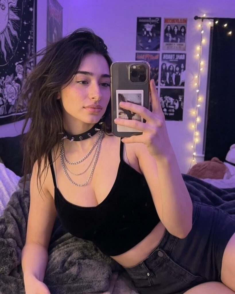 Био аккаунта звучит так: «21 • Florida The girl from your nightmares (<-_-) Shh… don’t tell my dad». Это сразу задаёт тон: готическая девушка из кошмаров, с лёгким бунтарским юмором, мистикой и намёком на тайну. Всё в духе тёмной романтики и подросткового вызова.
